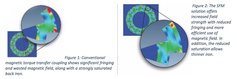 In a traditional magnet, the anisotropy within and outside a magnet is made as uniform as possible. A Shaped Field Magnet has a field with a deliberate divergence from the traditional anisotropic model. Figures 1 and 2 compare the conventional magnetic field with an SFM field arrangement. In the uniform magnetic field of a conventional magnet, a portion of the magnetic field is wasted. Whereas, in the SFM configuration, the magnetic field is shifted toward one side of the magnet, better utilizing the magnetic field.